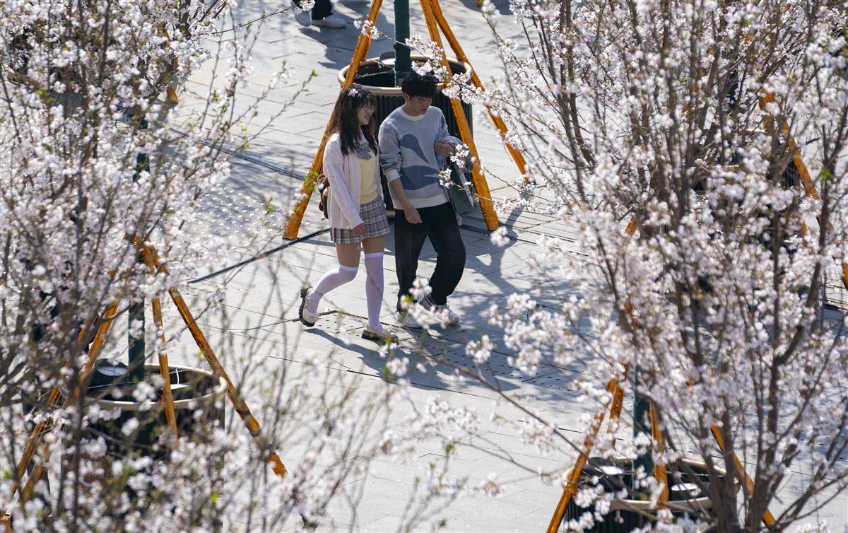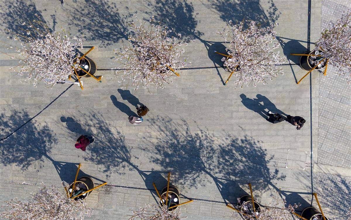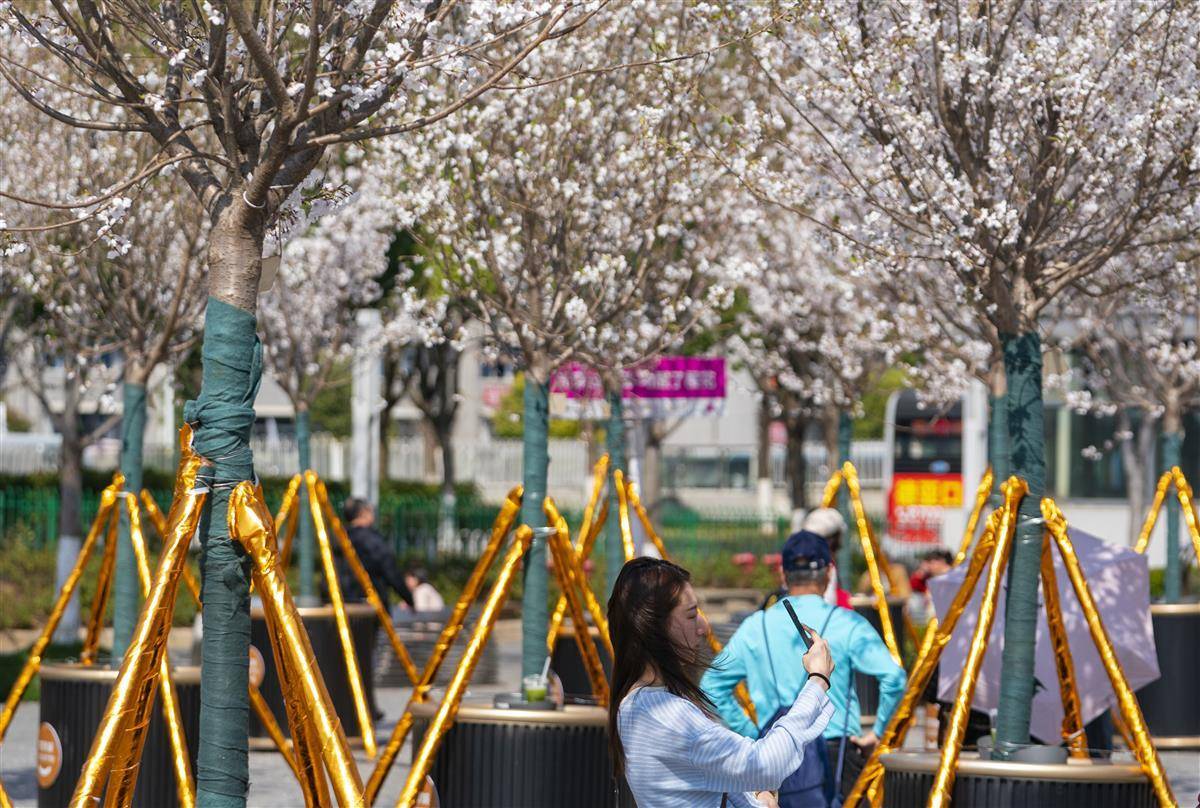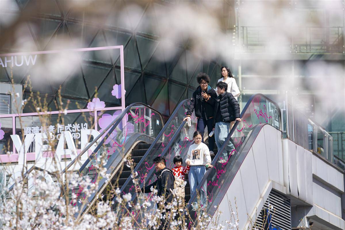 3月20日,武汉光谷世界城广场盆栽樱花缤纷绽放,吸引过往行人欣赏拍摄打卡。据悉,世界城光谷步行街引进盆栽樱花约260棵、地栽樱花160棵,打造武汉首条樱花商业街区。在珞喻路沿线、球屏前广场等区域打造赏樱打卡点,推出光谷樱花节活动。目前,武汉全城进入“樱花时间”。今年武汉樱花季,上新点位、玩法升级,让五湖四海来武汉看樱花的客人们,拉满期待。