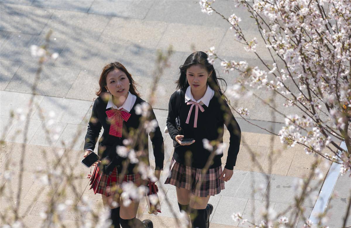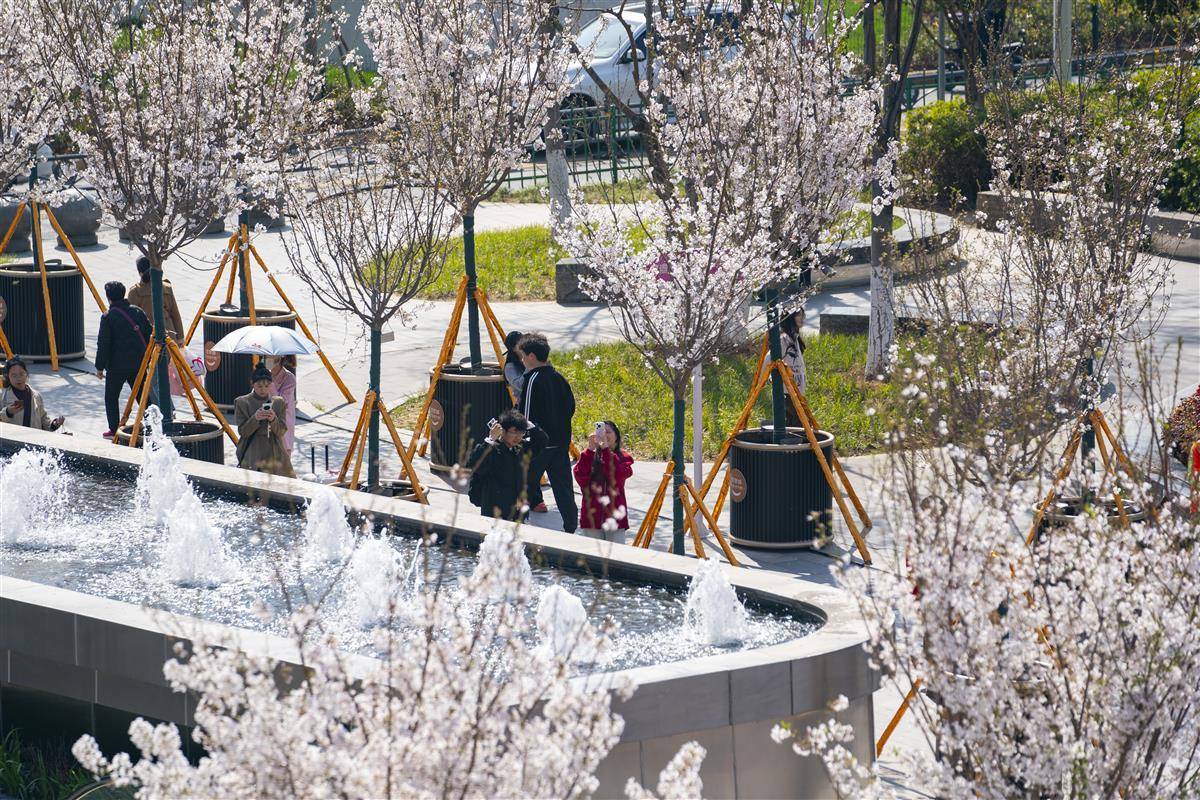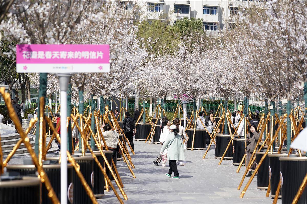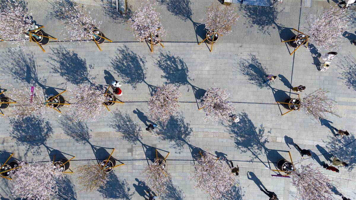3月20日,武汉光谷世界城广场盆栽樱花缤纷绽放,吸引过往行人欣赏拍摄打卡。据悉,世界城光谷步行街引进盆栽樱花约260棵、地栽樱花160棵,打造武汉首条樱花商业街区。在珞喻路沿线、球屏前广场等区域打造赏樱打卡点,推出光谷樱花节活动。目前,武汉全城进入“樱花时间”。今年武汉樱花季,上新点位、玩法升级,让五湖四海来武汉看樱花的客人们,拉满期待。