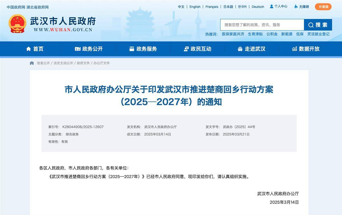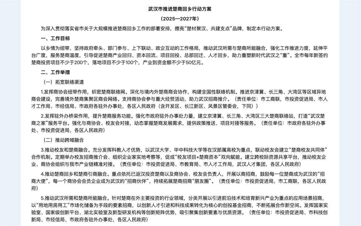 湖北日报讯 (记者成熔兴)3月21日,《武汉市推进楚商回乡行动方案(2025—2027年)》(以下简称《方案》)正式发布。方案提出,全市每年新签约楚商投资项目不少于200个,落地项目不少于100个,产业到资金额不少于50亿元。