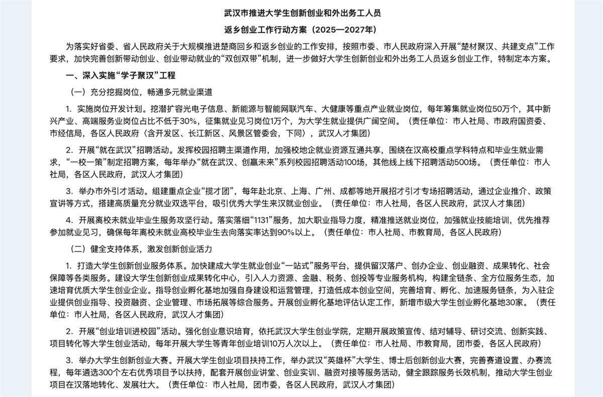 《方案》提出,将深入实施“学子聚汉”工程。一要充分挖掘岗位,畅通多元就业渠道。包括:(一)实施岗位开发计划。挖潜扩容光电子信息、新能源与智能网联汽车、大健康等重点产业就业岗位,每年筹集就业岗位50万个,其中新兴产业、高端服务业岗位占比不低于30%,征集就业见习岗位1万个,为大学生就业提供广阔空间。(二)开展“就在武汉”招聘活动。发挥校园招聘主渠道作用,加强校地企就业资源互通共享,围绕在汉高校重点学科特点和毕业生就业需求,“一校一策”制定招聘方案,每年举办“就在武汉、创赢未来”系列校园招聘活动100场,其他线上线下招聘活动500场。(三)举办市外引才活动。组建重点企业“揽才团”,每年赴北京、上海、广州、成都等地开展招才引才专场招聘活动,通过企业推介、政策宣讲等方式,搭建高质量充分就业双选平台,吸引优秀大学生来汉就业创业。()四开展离校未就业毕业生服务攻坚行动。落实落细“1131”服务,加大职业指导力度,精准推送就业岗位,加强就业技能培训,优先推荐参加就业见习,确保每年离校未就业高校毕业生去向落实率达到90%以上。