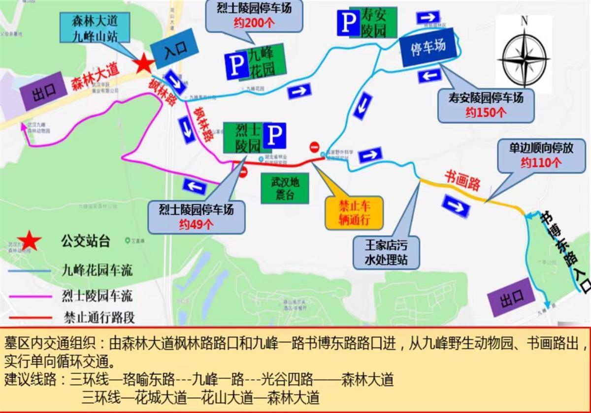 管制路段:机动车一律由森林大道枫林路口(寿安陵园)进,从九峰野生动物园路口或九峰一路书画路出,其中在书博东路→堤顶路→书画路实行单向循环交通。