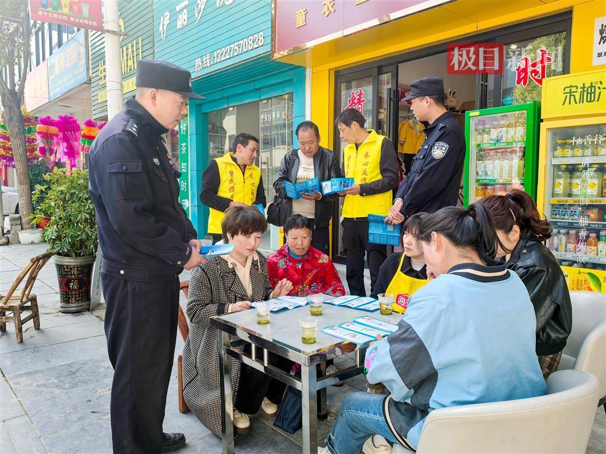 “不要轻易点击陌生人发来的链接,针对新型骗局要提高警惕,多学点防诈技巧。谨记,天上不会掉馅饼!”3月21日,在湖北省襄阳市保康县寺坪镇大宏街,民警和“反诈黄金甲”志愿者正在向群众宣讲反诈知识。