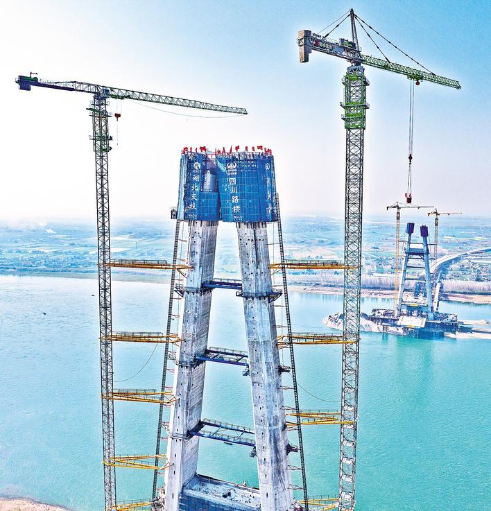 3月21日,枝江长江大桥北岸主塔顺利封顶。 (湖北日报全媒记者 刘曙松 通讯员 郑子贤 摄)