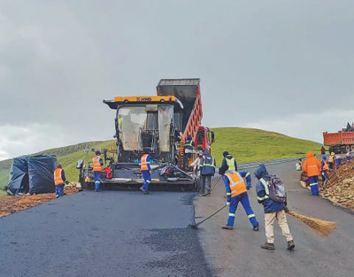 莫塞公路施工期间,工人们正在铺设沥青。 以上图片均为青建集团提供 |