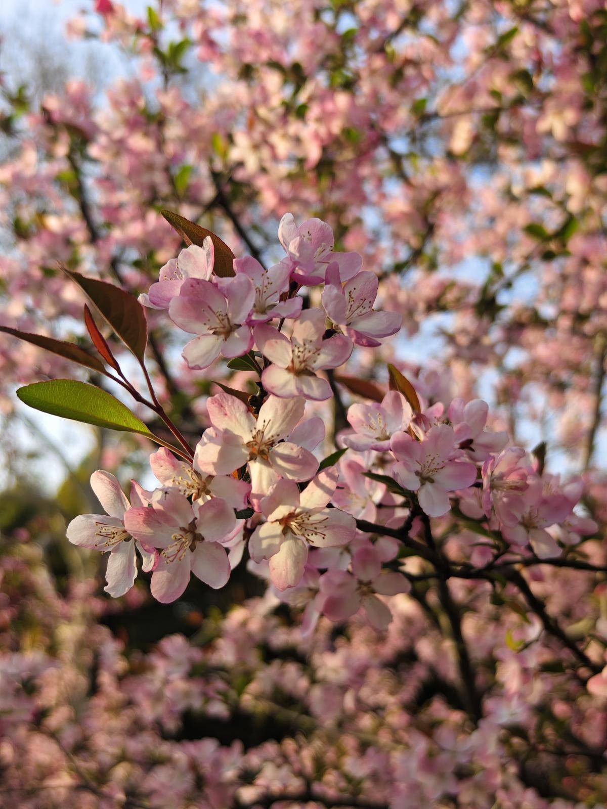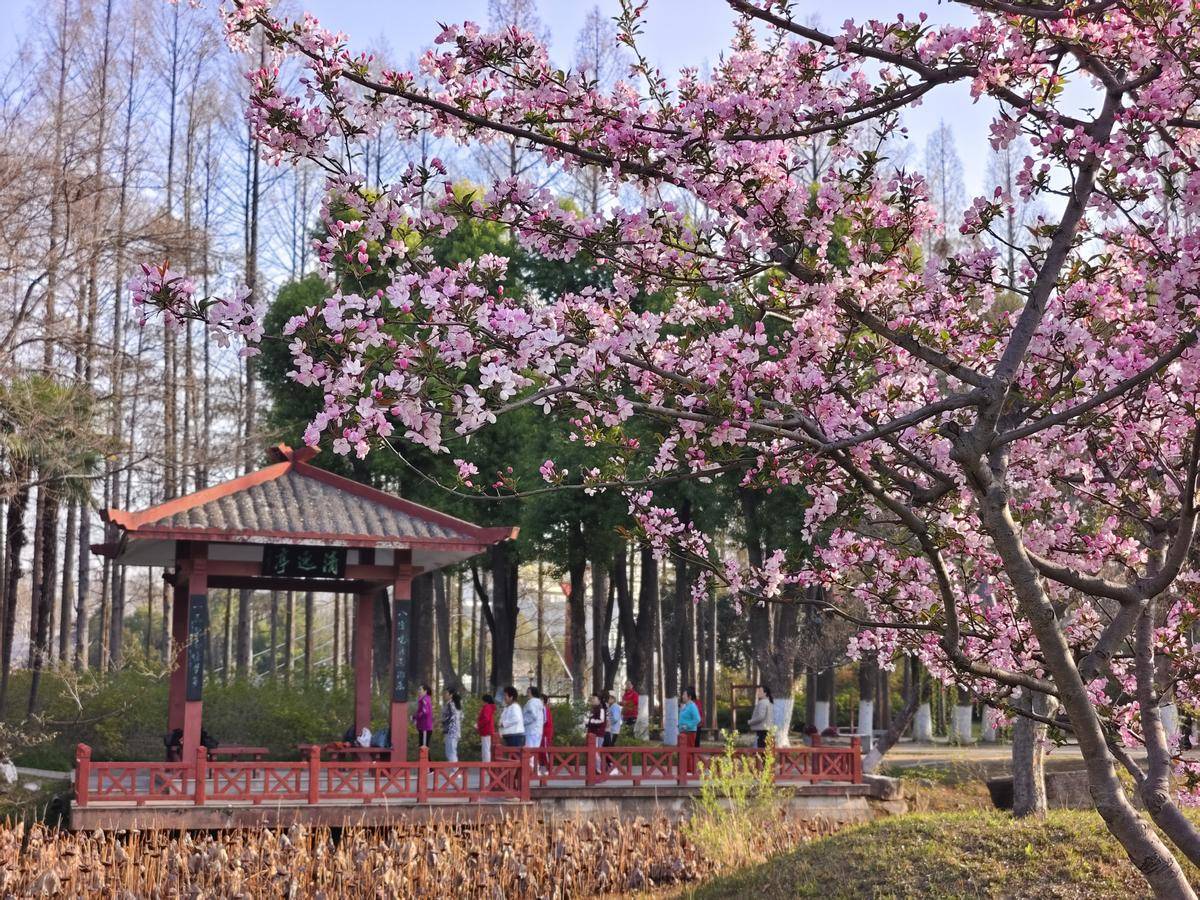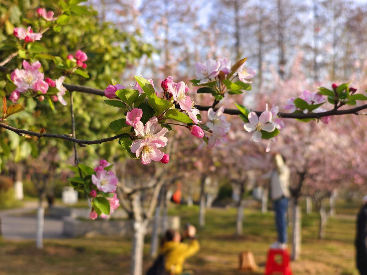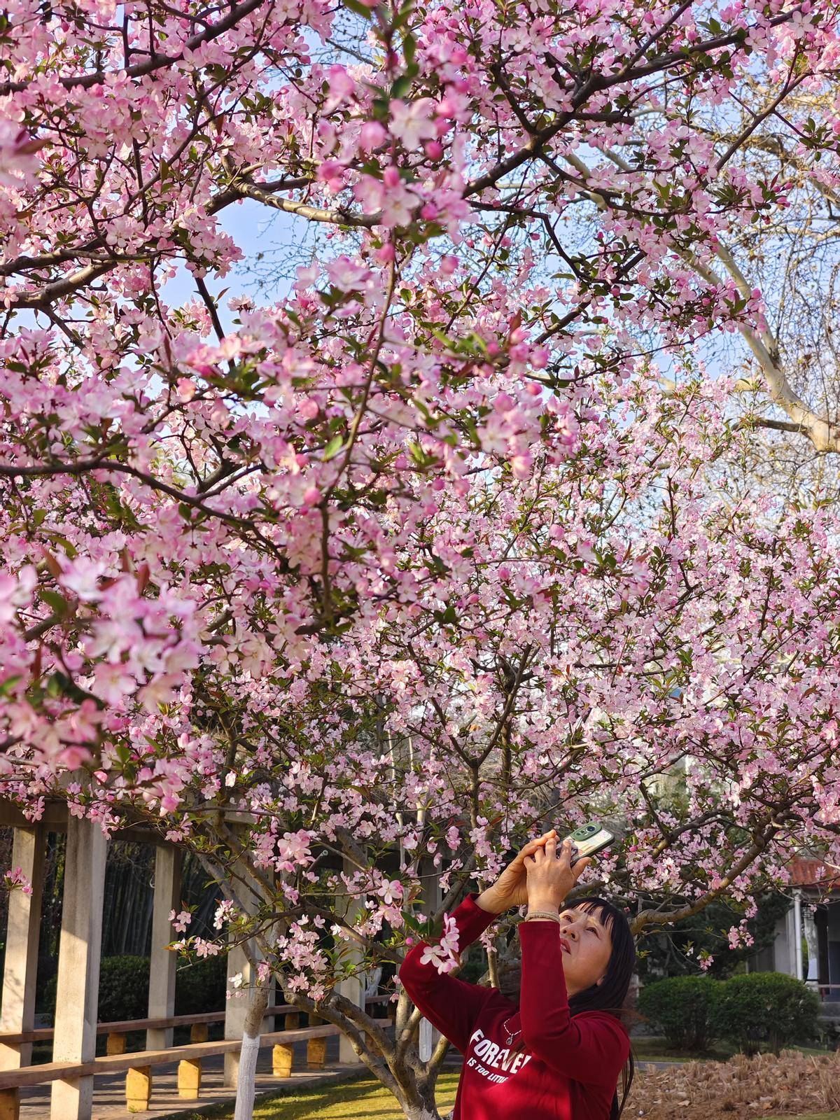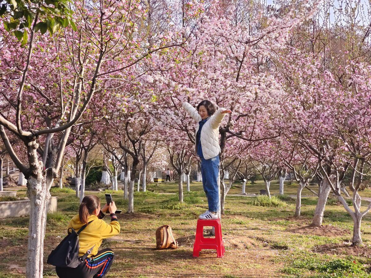 3月22日清晨,市民在武汉市青山公园樱花树下拍照、晨练。(湖北日报全媒记者 柯皓 摄)