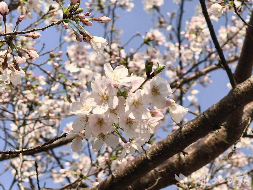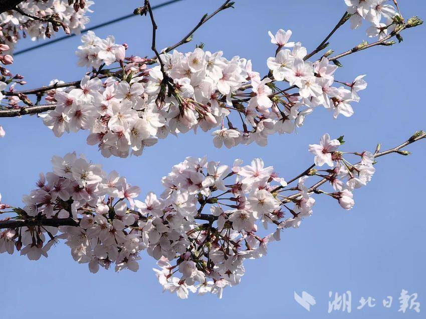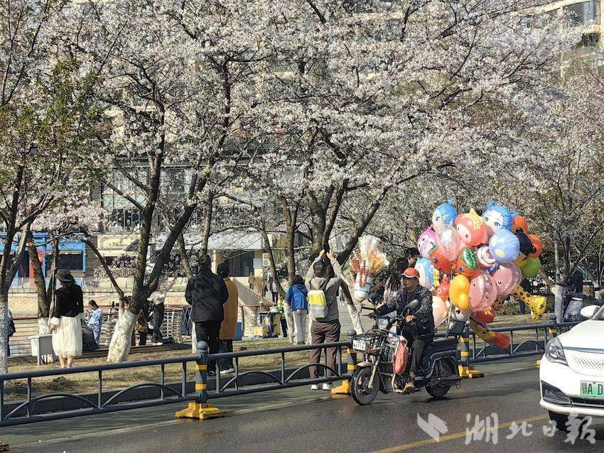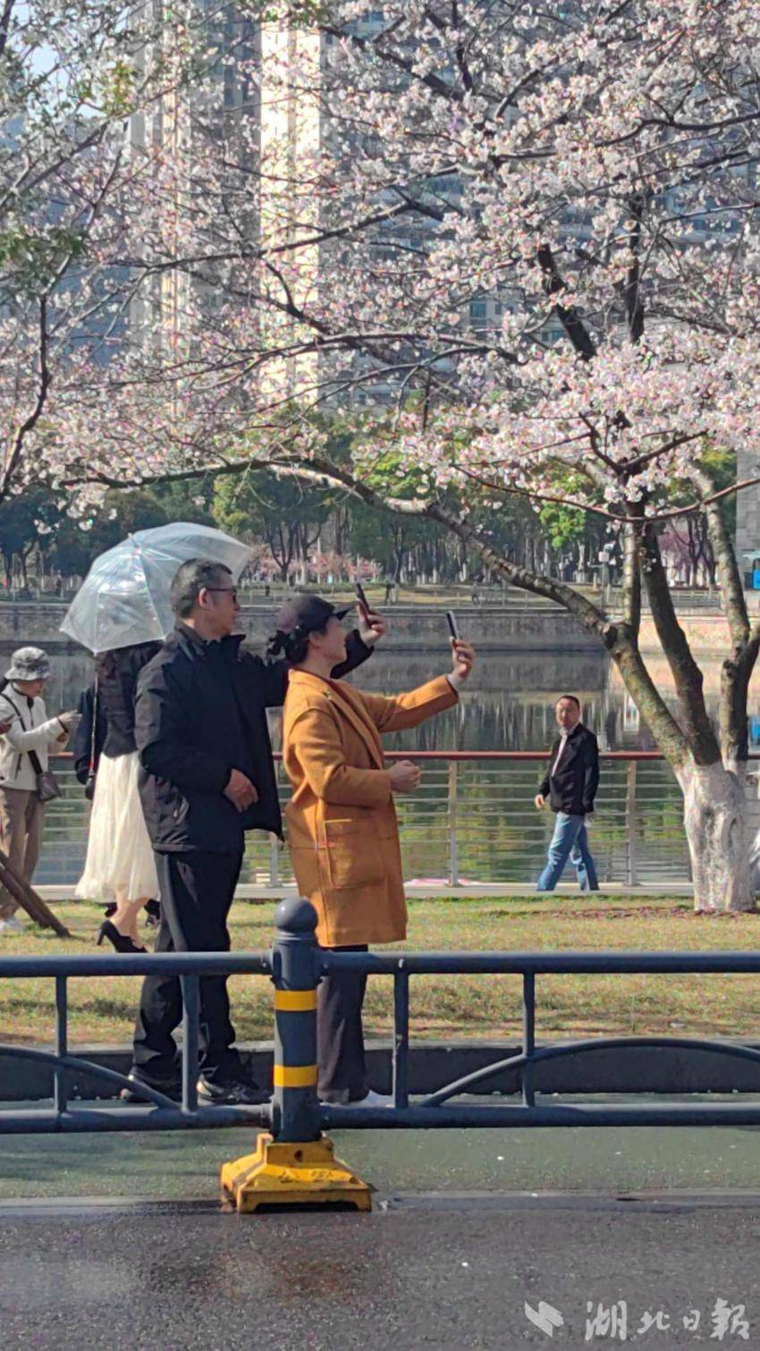 湖北日报讯(记者张倩倩)3月22日上午9点,江汉区西北湖公园樱花大道充满浪漫诗意。作为汉口金融区核心地带的城市公园,这里染井吉野樱正值盛花期,粉白花海与周边摩天大楼相映成趣,吸引众多外地游客专程前来。