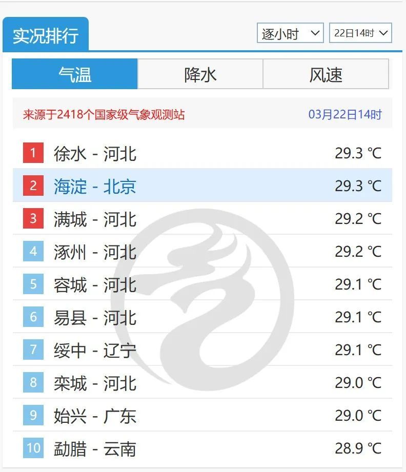 北京海淀的气温直接“卷”成了全国(并列)第一,不仅刷新了当地3月最高气温纪录,更是在之后成功冲上30℃,成为海淀自1959年有完整观测以来,首次在3月上30℃,也是最早30℃日期纪录(原纪录2004-04-08)。
