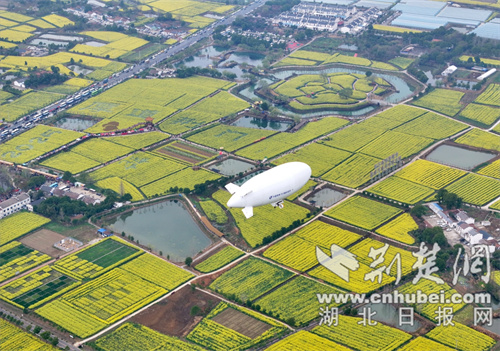 “祥云”AS700载人飞艇首次亮相江汉平原油菜花海。通讯员 供图