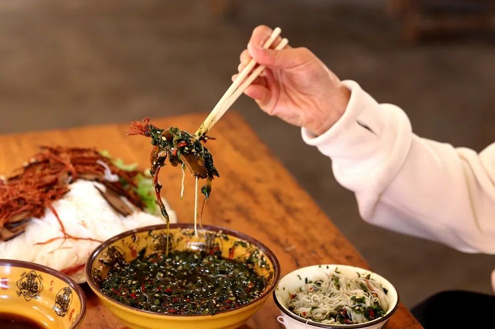 米线、油淋干巴丝,烤牛肝、生白菜裹着蘸水入口,舌尖酸甜苦辣,颇有层次。