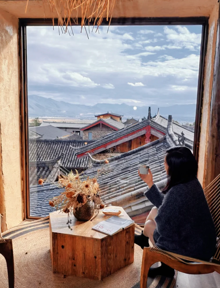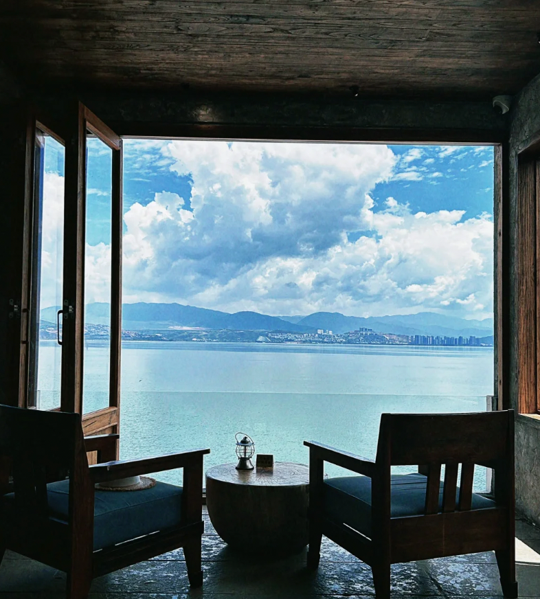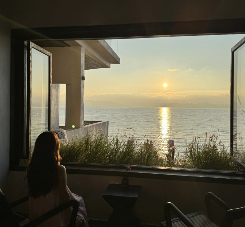 随便找一个“海景”座位,推门就撞见一片波光粼粼的蓝。晨雾未散时,这里像座飘浮的宫殿,落地窗把苍山云絮、潋滟水光统统框成会流动的装饰画。