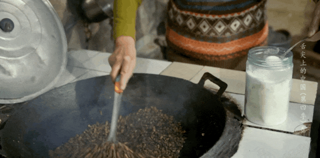 晒干的咖啡果放入石臼中“chuǎ”一下,竹编簸箕分离外壳,再将咖啡豆倒入土灶大锅,加入几勺咸盐,炒熟后倒入石磨碾碎,便成了咖啡粉。