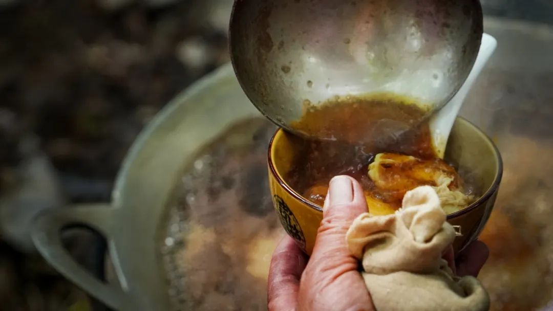 喝完一杯正宗的古法咖啡,还能吃到特别的咖啡煮鸡蛋。铁锅烧热咖啡,加入新鲜鸡蛋煮至溏心,舀进碗里加入红糖、核桃碎。咖啡煮鸡蛋不仅有着红糖鸡蛋的甜蜜鲜嫩,还多了咖啡的苦涩和独特的香气。