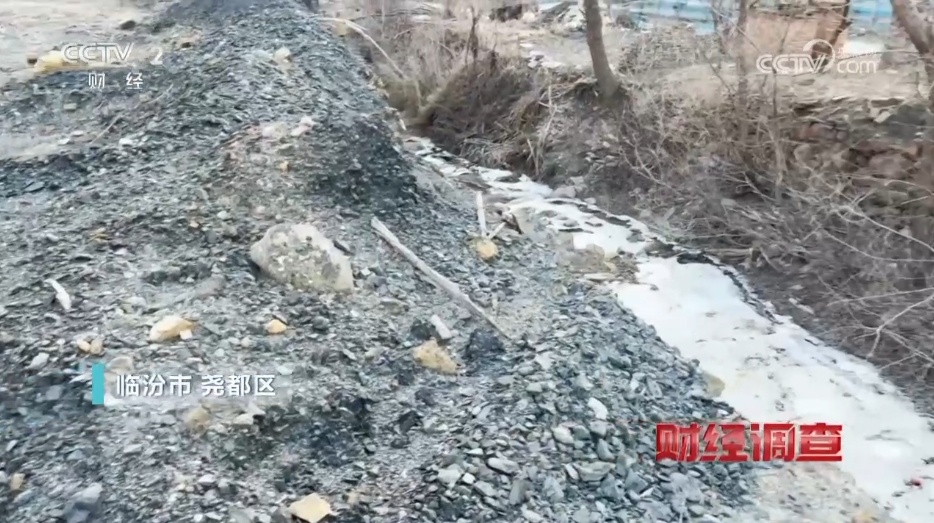 记者调查发现,在汾河流域,煤矸石随意填埋、堆放的乱象并非个案。在临汾尧都区河底村,村里小河的河道两岸有至少200米长的矸石,被任意堆砌。小河附近已经关停的煤业公司旁,也露天堆积了大量煤矸石。