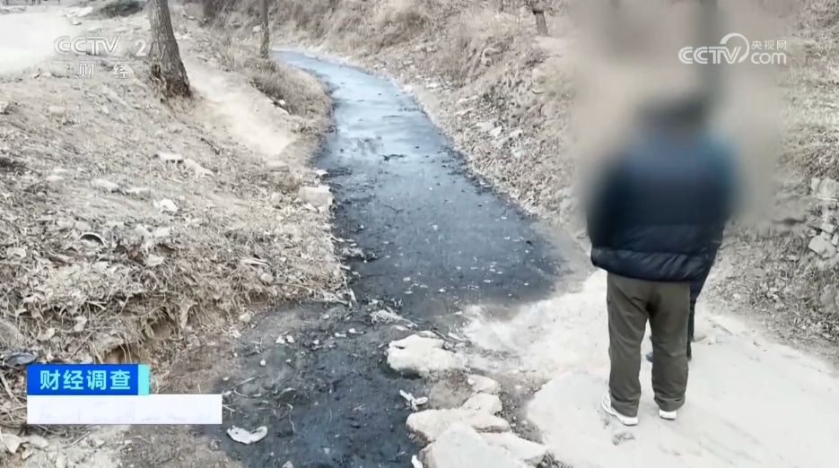 随后,记者跟随村民来到这个煤矸石填埋场附近的水沟,眼下正是枯水期,水沟已干涸断流,但这道黑色淤泥疤痕,依然清晰可见。这条黑色的水沟从煤矸石填埋场流出,直通村里的水道。而这个村庄距离黄河一级支流——汾河,仅有300米的距离。