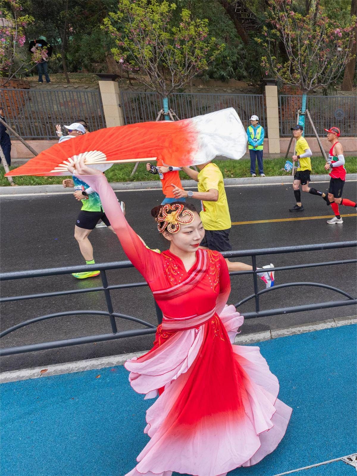 东湖南路音乐加油站,演员们表演楚风舞蹈《楚韵风华》为选手们加油。(湖北日报全媒记者 柯皓 摄)