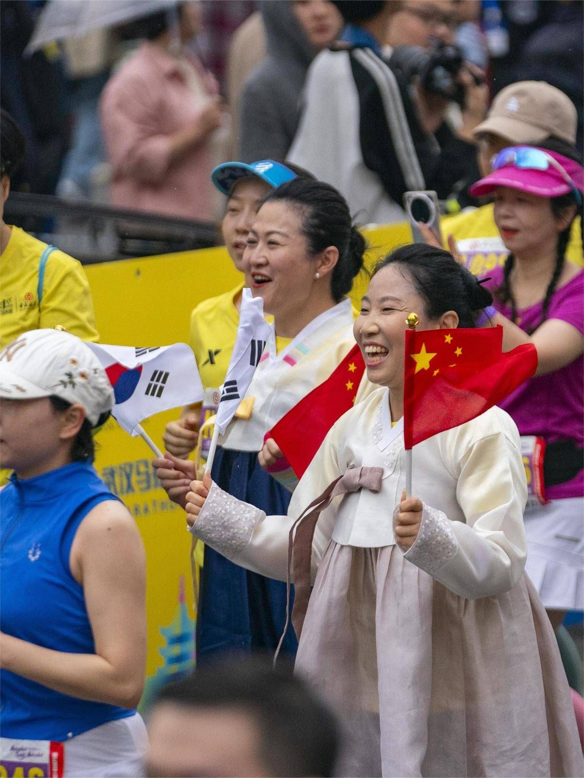 2025武汉马拉松鸣枪开跑,3位韩国友人身穿民族服装,手拿中韩两国国旗跑马。(湖北日报全媒记者 魏铼 摄)