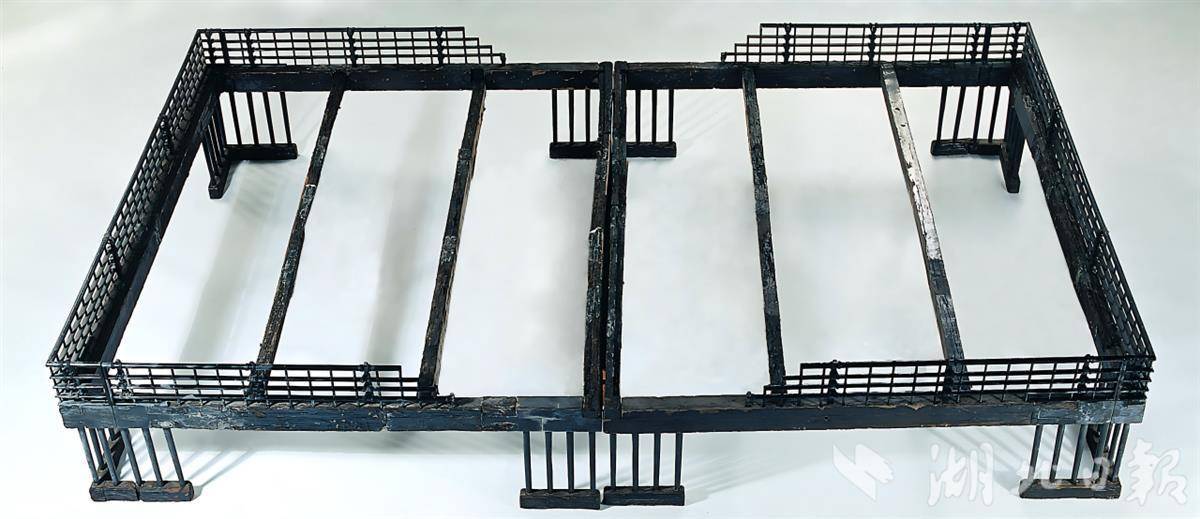 湖北省博物馆讲解员温静说,为节省空间或便于携带而精心设计的折叠床,体现了楚人技艺之高超。折叠分三步走:轻抬中间的“机关杆”(中横撑),让藏在卯孔里的钩状栓钉弹开;再松开两侧框架,抽掉中间的加固杆;依次向内折叠床板,瞬间变成可塞进马车的“行李条”。