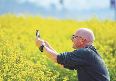 江西南昌红谷滩区九龙湖湿地公园内,外国游客正在花海中赏花拍照。