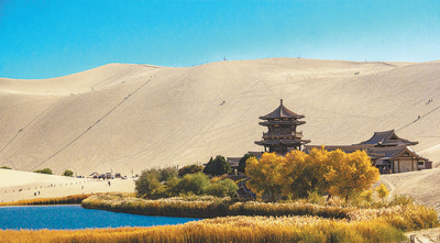 甘肃敦煌鸣沙山月牙泉景区。