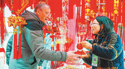 陕西西安新城区年货展销会现场,外国游客正在选购饰品。