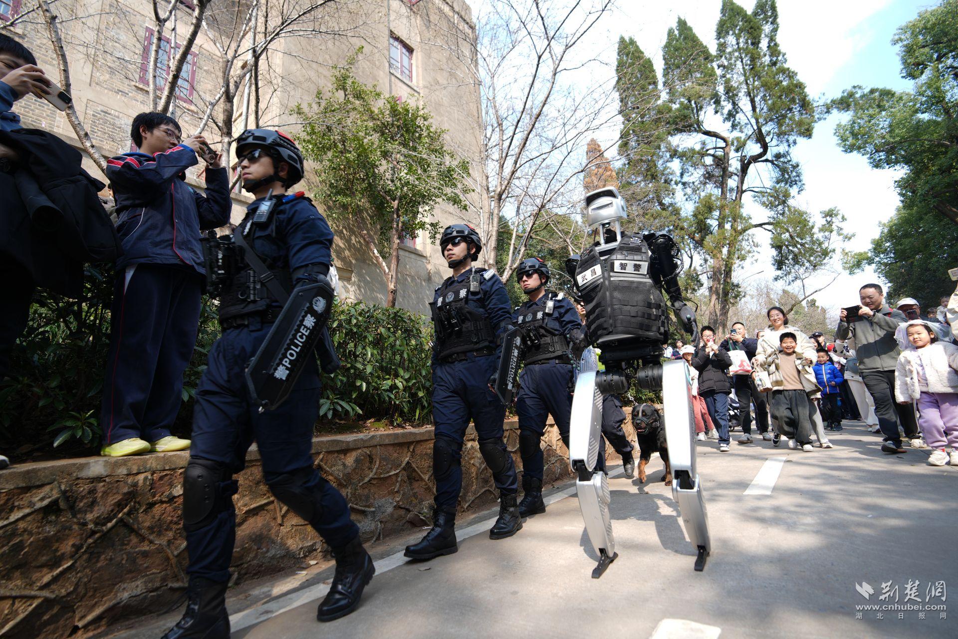武昌分局“智警小珞”在樱花大道巡逻。通讯员供图