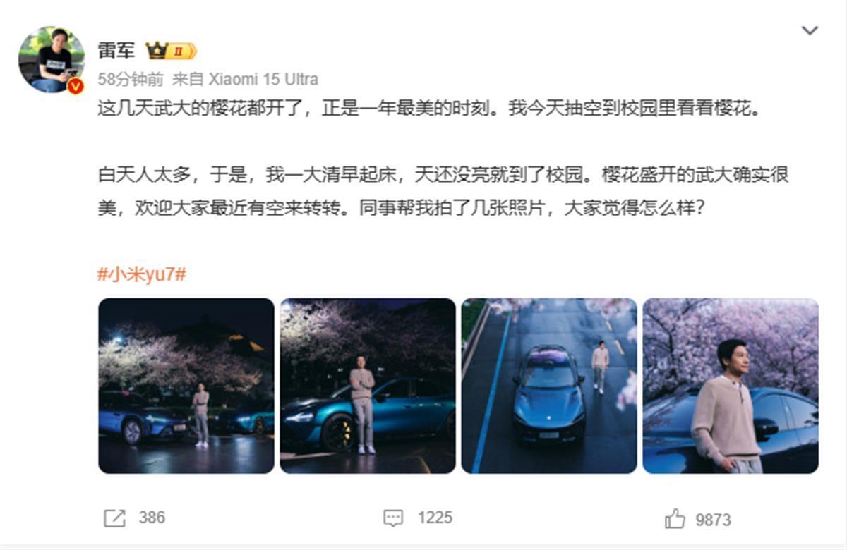 3月25日13时左右,雷军发布微博,带上了“小米yu7”的标签,并表示:“这几天武大的樱花都开了,正是一年最美的时刻。我今天抽空到校园里看看樱花。白天人太多,于是,我一大清早起床,天还没亮就到了校园。樱花盛开的武大确实很美,欢迎大家最近有空来转转。同事帮我拍了几张照片,大家觉得怎么样?”