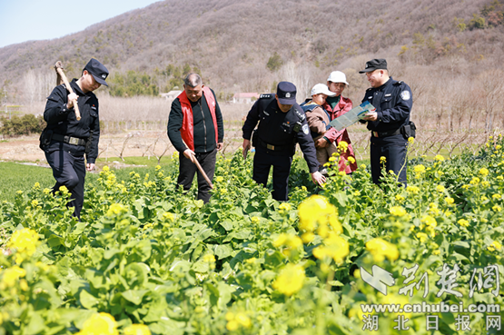 春分时节,东宝区栗溪镇的油菜田翻涌着金色波浪。3月20日清晨,几道藏蓝身影躬身拨开齐腰的菜花,露水浸透警服。民警张昌洪的鞋裹着厚重的红泥,镰刀划过荆棘丛生的背阴坡:“鞋上的泥越厚,心里的底越清,这片腐殖土最易藏‘毒苗’。”