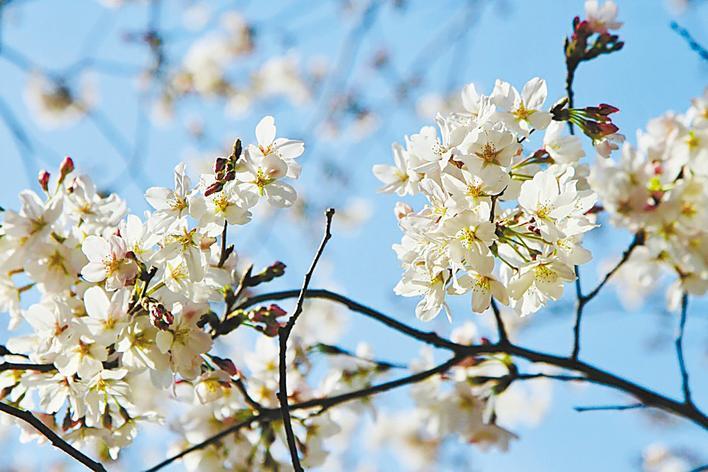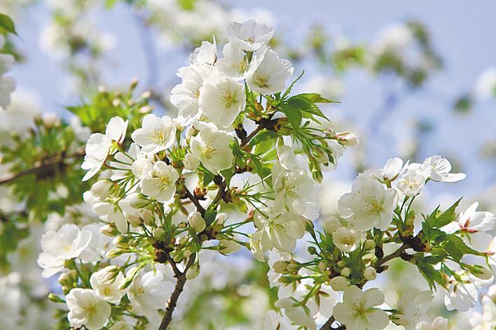 野生樱花的代表,花期在3月中旬,花朵洁白如雪,单瓣,呈伞房状开放,盛开时花叶齐发,满树烂漫。萼片呈披针形,边缘有锯齿,花整体无毛。与染井吉野樱相比,大岛樱的花色更为素雅,种植范围较广,同样多见于东湖樱花园、武汉大学等多个公园和景区。
