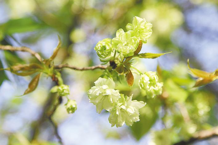 较为罕见的“绿樱”品种,花期在3月底到4月初,花呈浅黄绿色,瓣约15枚,质稍硬,最外方的花瓣背部带淡红色,花瓣层叠如绢,游客远看似翠叶覆枝,近观方觉满树繁花,以其花色新奇而引人喜爱。东湖樱花园集中栽种了十几余株郁金,目前已经初开。