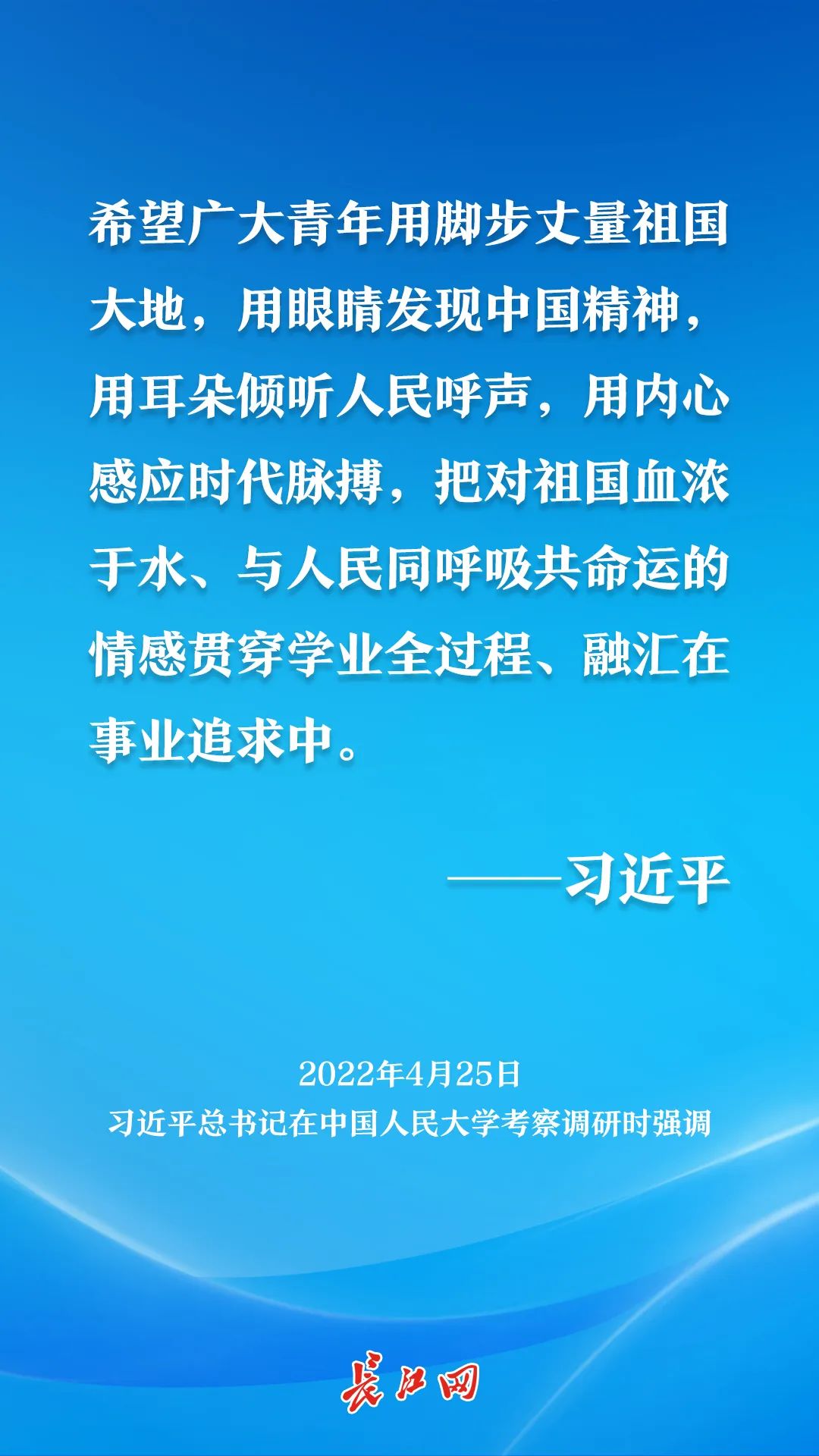 “希望广大青年用脚步丈量祖国大地,用眼睛发现中国精神,用耳朵倾听人民呼声,用内心感应时代脉搏……”2022年4月25日,习近平总书记在中国人民大学考察调研时,对大学生提出殷殷嘱托。