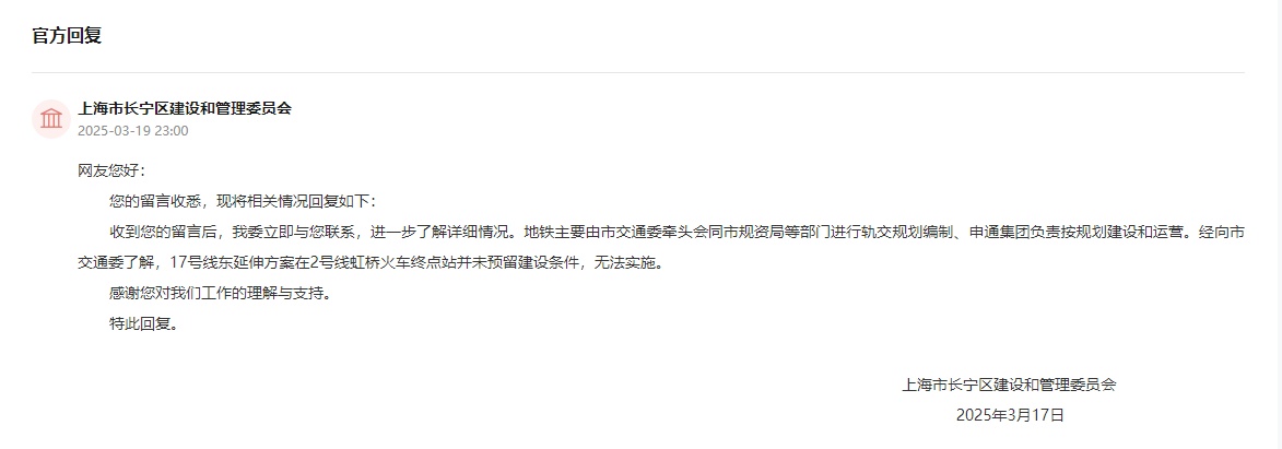 对此,上海市长宁区建设和管理委员会回复称,地铁主要由市交通委牵头会同市规资局等部门进行轨交规划编制、申通集团负责按规划建设和运营。经向市交通委了解,17号线东延伸方案在2号线虹桥火车终点站并未预留建设条件,无法实施。