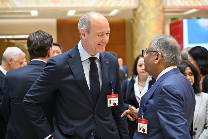 论坛外方主席、西门子股份公司董事会主席博乐仁(左)与嘉宾在中国发展高层论坛2025年年会上交流(2025年3月23日摄)。新华社记者 李鑫 摄