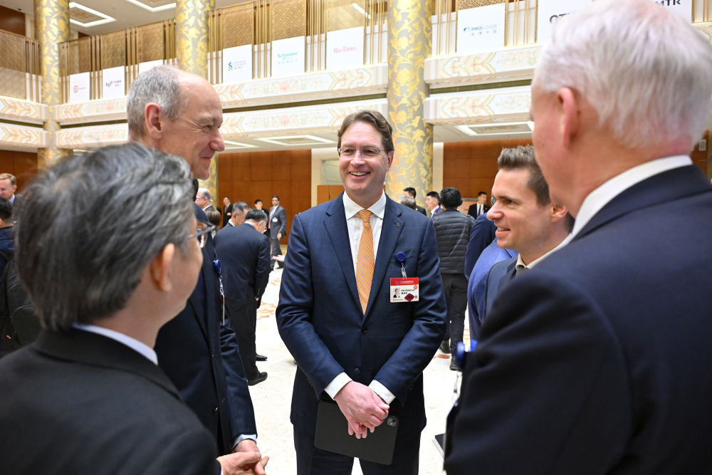 梅赛德斯-奔驰集团董事会主席康林松(中)在中国发展高层论坛2025年年会上与嘉宾交流(2025年3月23日摄)。新华社记者 李鑫 摄