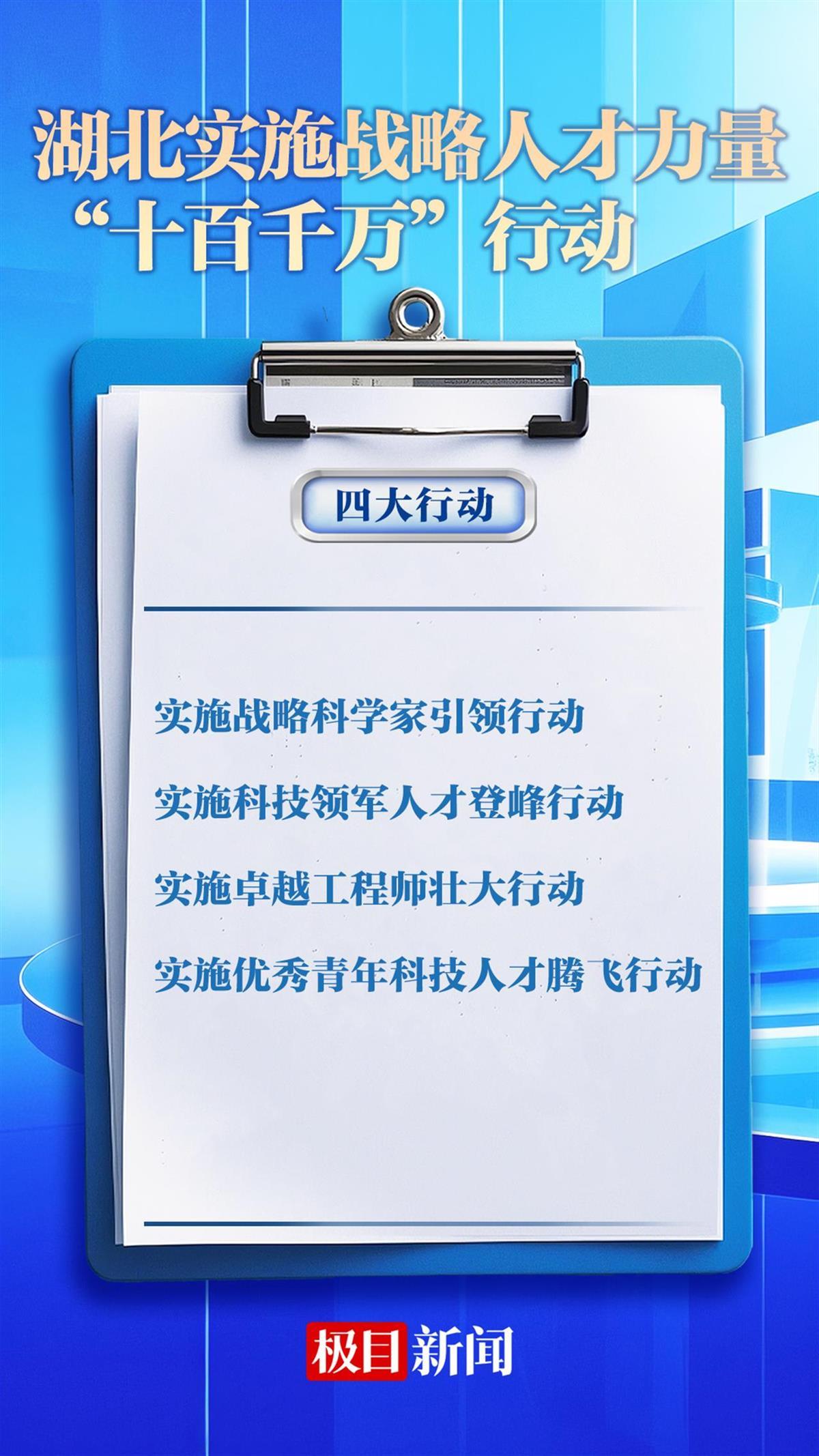 湖北省委组织部部务委员王发读在发布会上介绍,《行动方案》提出了总的目标任务,用3-5年时间,培养引进10名战略科学家、100名科技领军人才、1000名卓越工程师、10000名优秀青年科技人才。为此,《行动方案》部署了战略科学家引领、科技领军人才登峰、卓越工程师壮大、优秀青年科技人才腾飞“四大行动”。