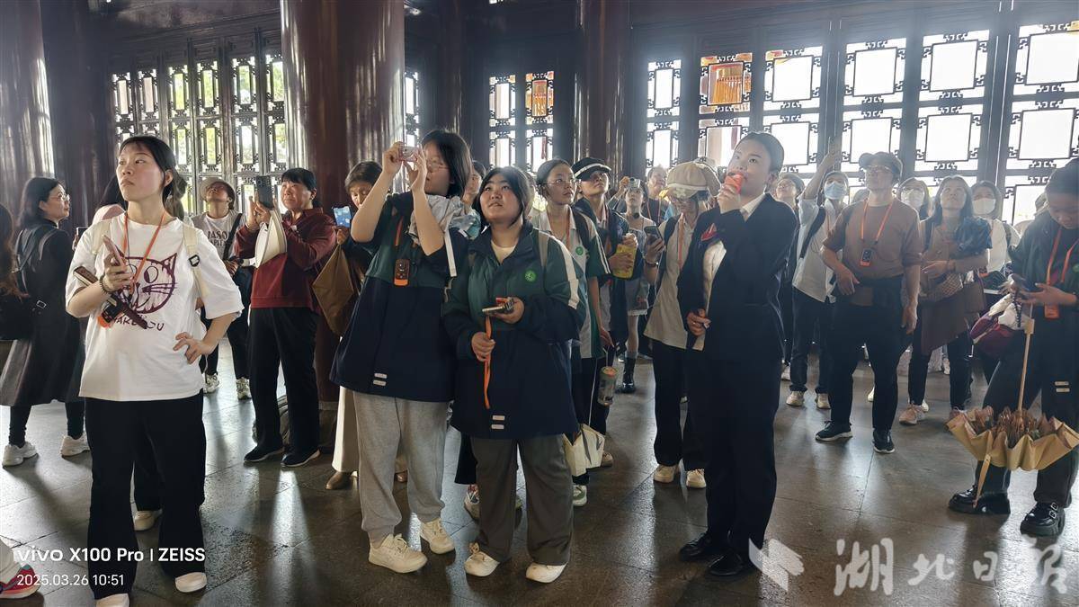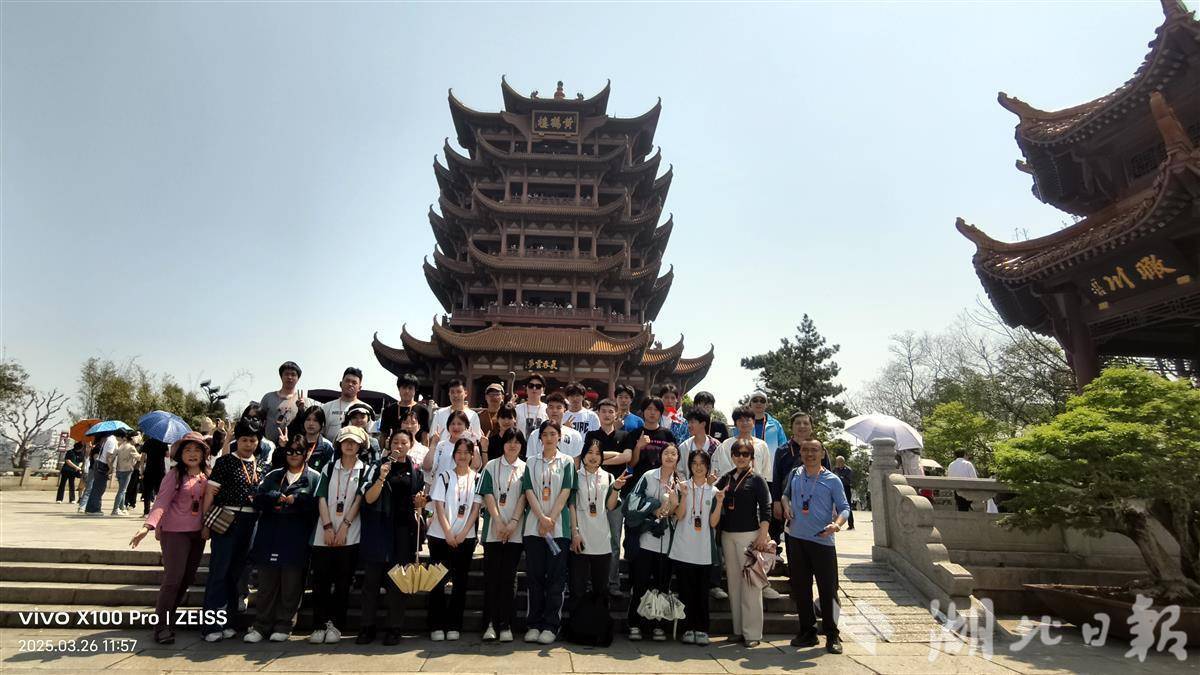 “各位请看,黄鹤楼东门这组‘三楚一楼’牌坊,正是引导游客进入文化时空的钥匙。”上午9:30,身着职业装的宋导游以标准站姿开启讲解示范。同学们专注地观察金牌导游的站位角度、手势幅度,不时记录拍摄讲解要点。