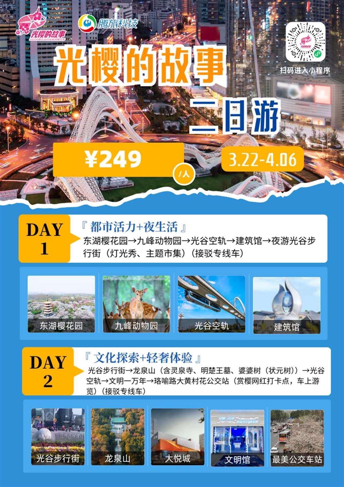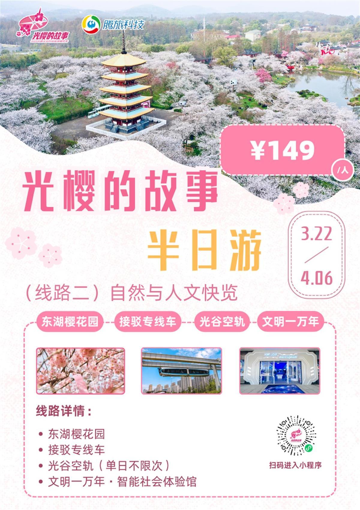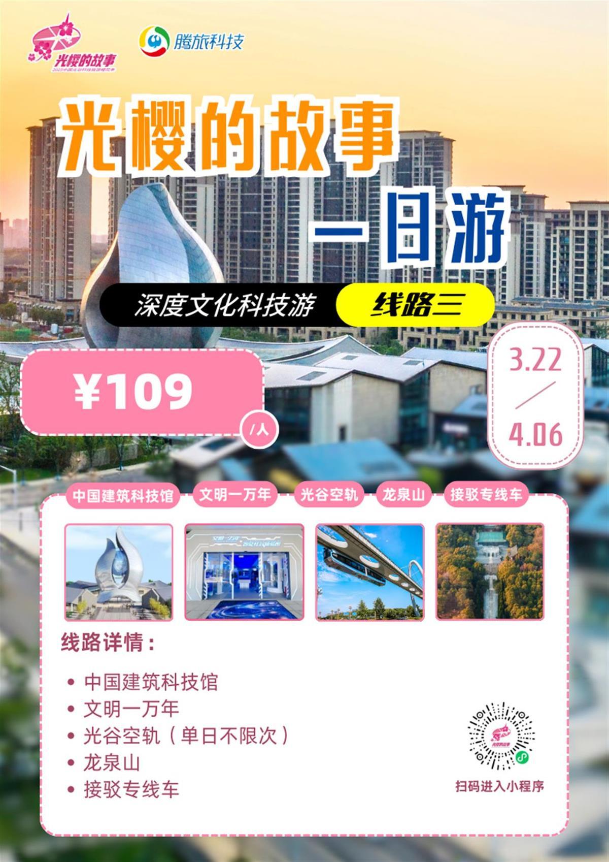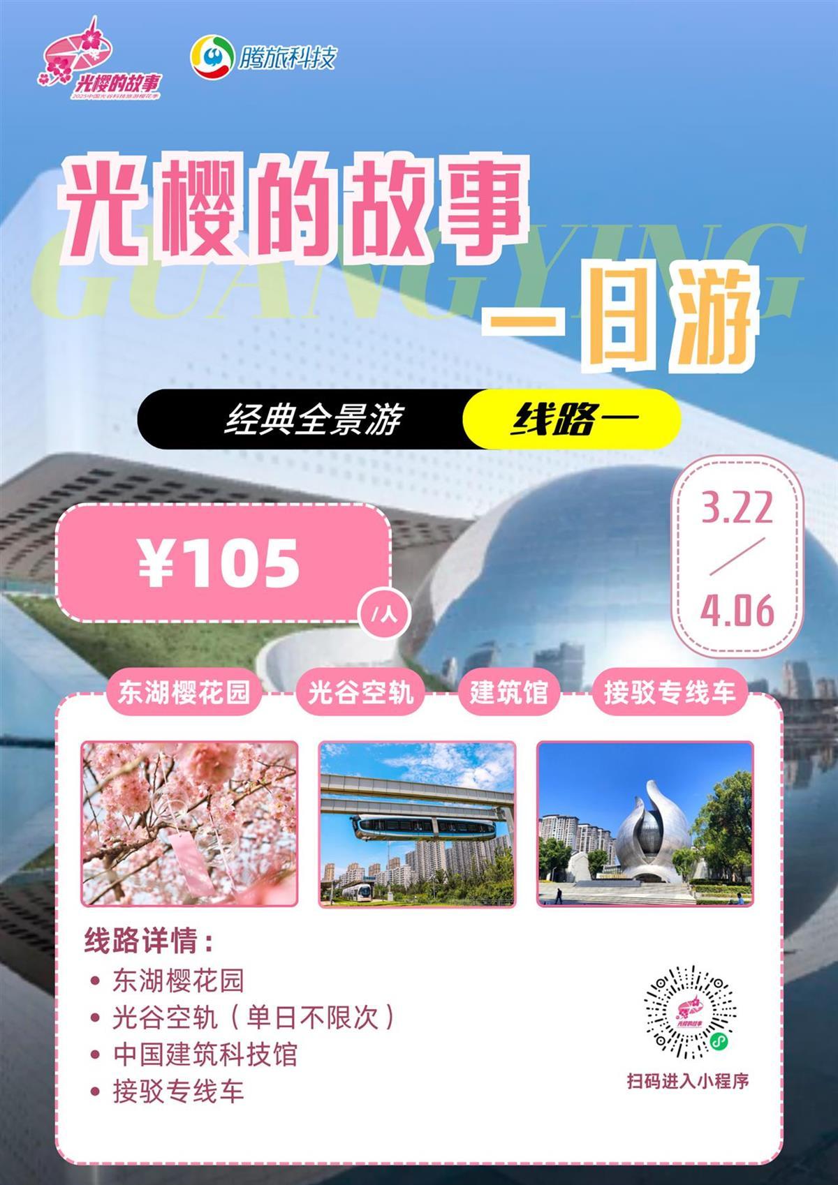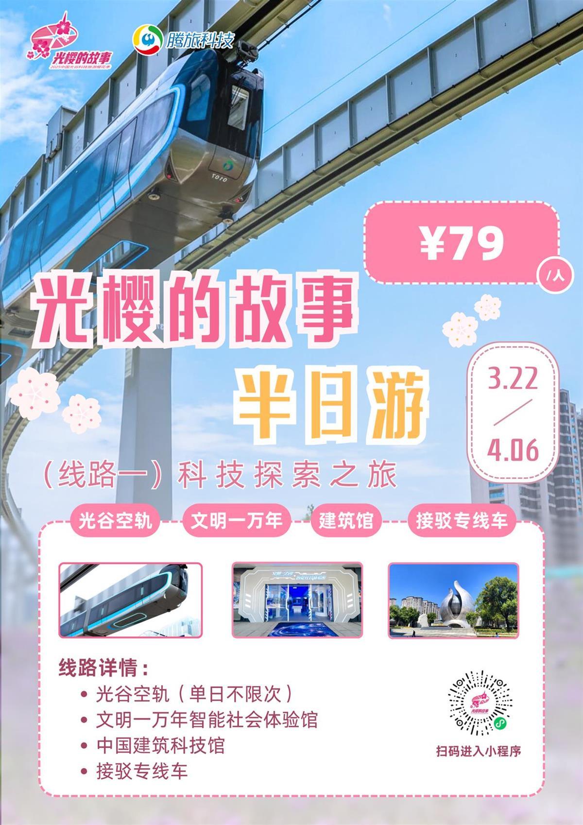 当樱花遇见硬核科技,会碰撞出怎样的火花?2025年樱花季,武汉东湖高新区以“科技+生态”双IP为核心,创新打造“光樱的故事”主题科技旅游线路,将浪漫樱花与前沿科技成果深度融合,为游客呈现一场“可触摸的未来城市实验室”之旅。2025年3月22日至4月6日,游客可通过“光樱的故事”微信小程序一键预约半日游、一日游及两日游主题线路,在自然之美与科技之光的交织中,感受高新区“科创基因”的独特魅力。