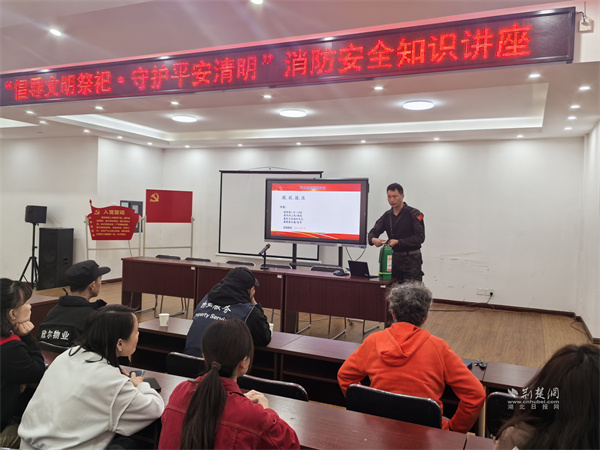 荆楚网(湖北日报网)讯(通讯员 许梦莹)清明节临近,为提升辖区企业、商户及居民的消防安全意识,筑牢节日期间安全防线,3月27日,武汉市武昌区白沙洲街道星苑社区联合普消湘安防火咨询服务中心,开展了“倡导文明祭扫 守护平安清明”消防安全知识讲座。辖区企业负责人、个体工商户及居民代表共30余人参与。