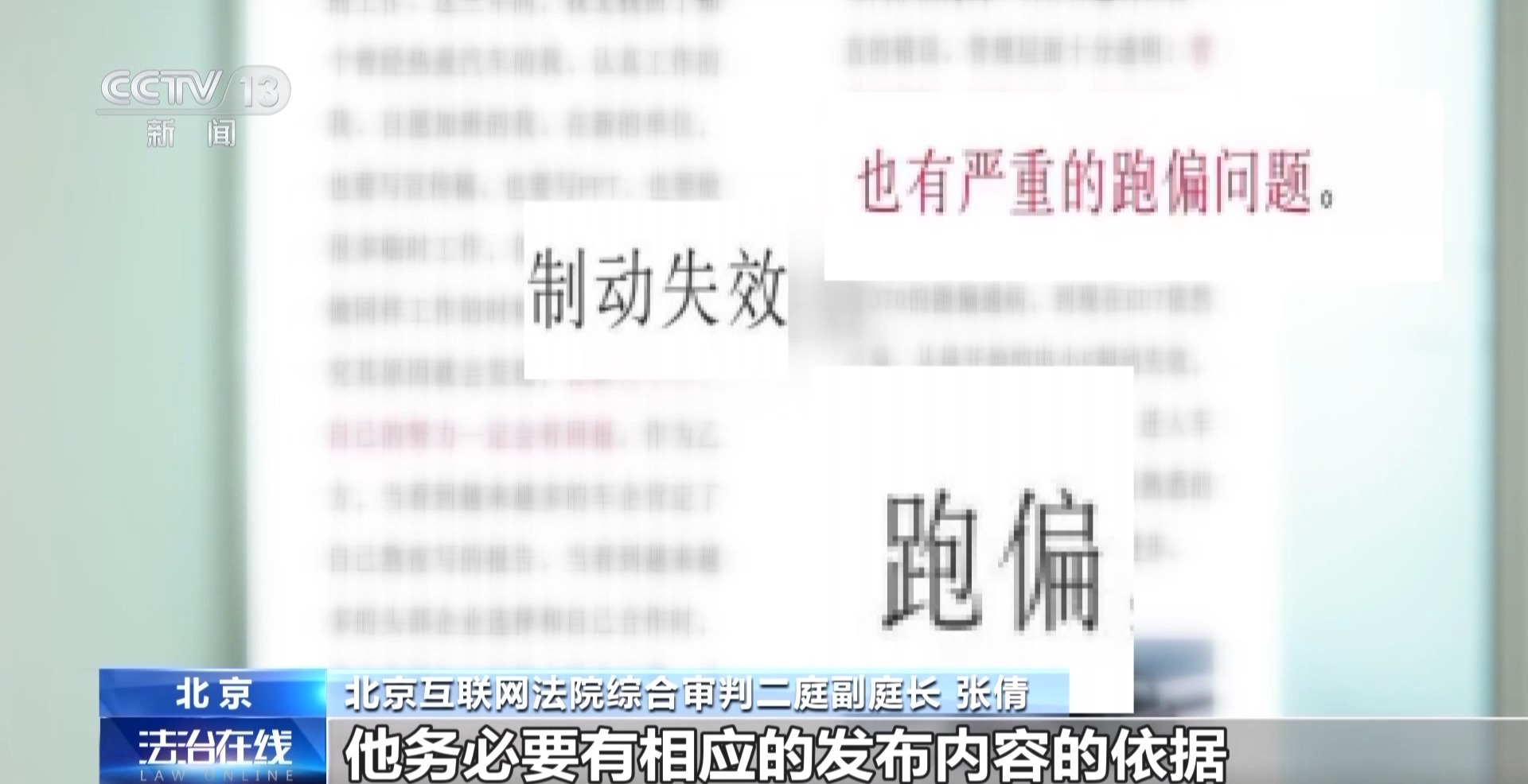 北京互联网法院综合审判二庭副庭长 张倩:这些其实涉及车辆非常核心的安全性问题的一些测评语言,被告又无法提供相应的证据进行支撑。同时原告也向法院提交了被告测评中涉及的车辆的实验室的一些报告和国家检测的报告,我们发现都是合格的,在这样的一个情况下,我们认定被告这样的测评语言是涉及侵犯了原告的名誉权。