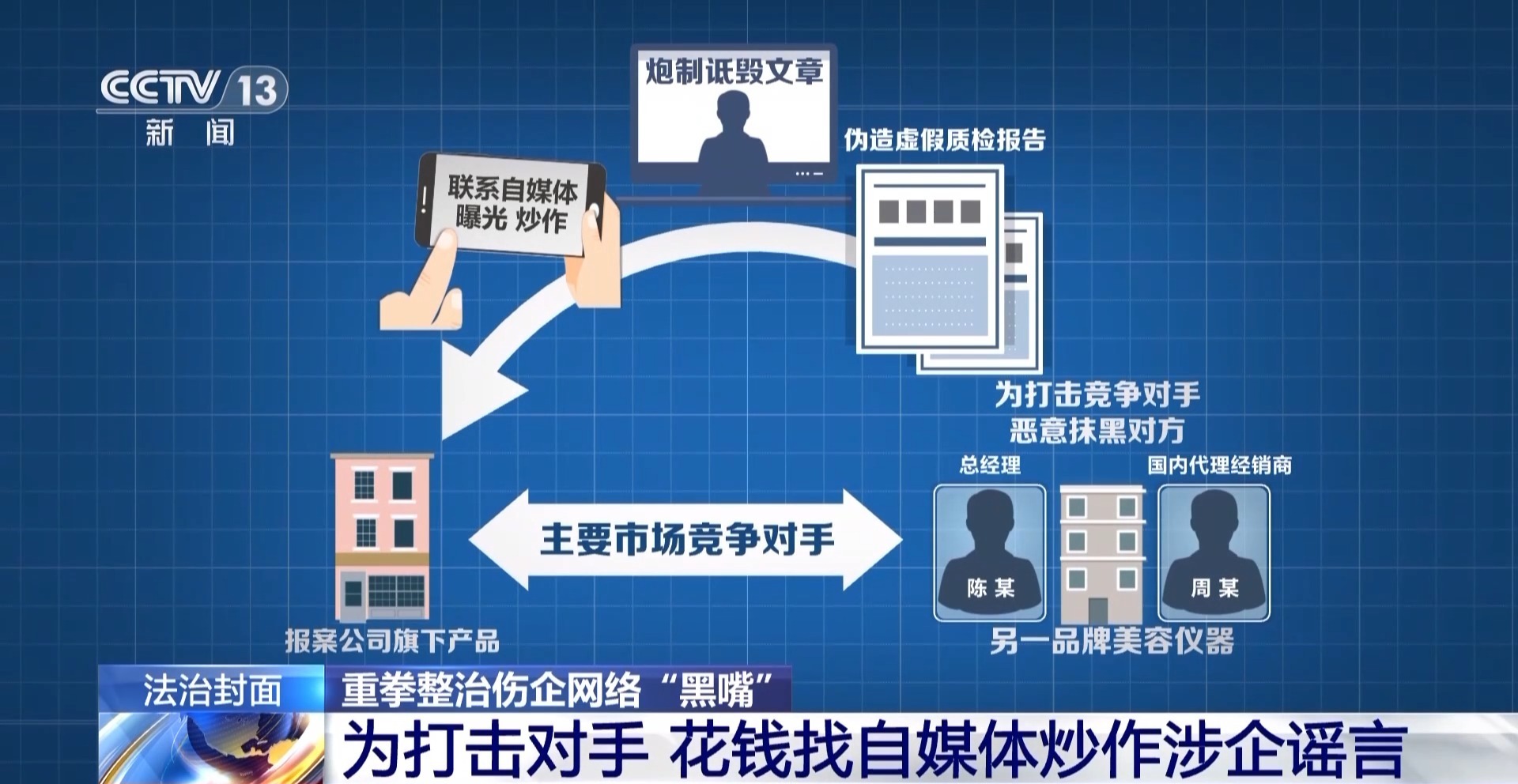 警方进一步调查发现:周某是另一品牌美容仪器的国内代理经销商,是报案公司旗下产品的主要市场竞争对手。周某与公司总经理陈某为打击竞争对手、恶意抹黑对方,伙同他人伪造了两份虚假质检报告,找网络写手炮制出诋毁文章,并联系自媒体从业人员通过网络平台进行曝光、炒作。