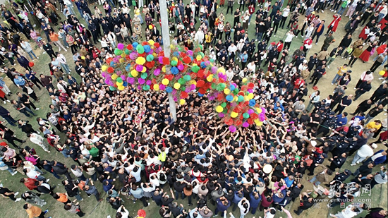 (三月三当天,周边群众抢绣球祈福。)