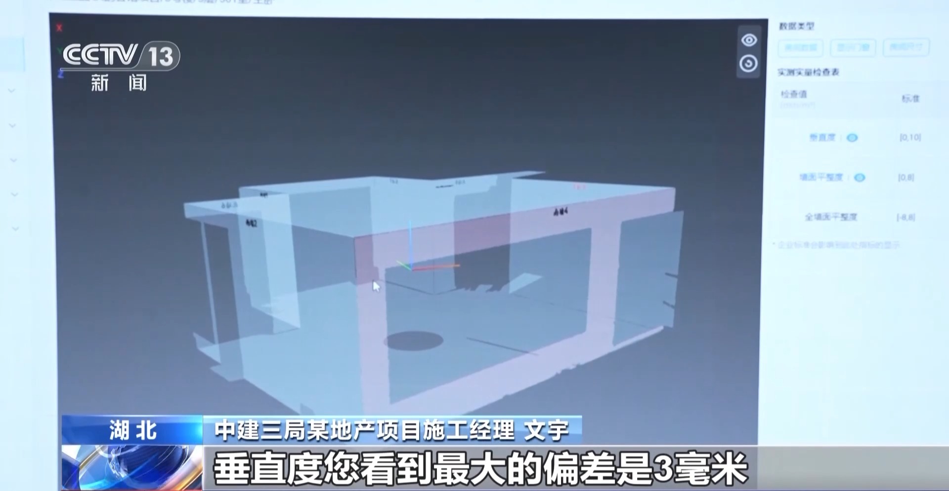 中建三局某地产项目施工经理 文宇:垂直度现在偏差最大是3毫米。墙体的垂直度和平整度直接影响到我们后期精装的质量,所以我们从最开始就对质量进行把控。