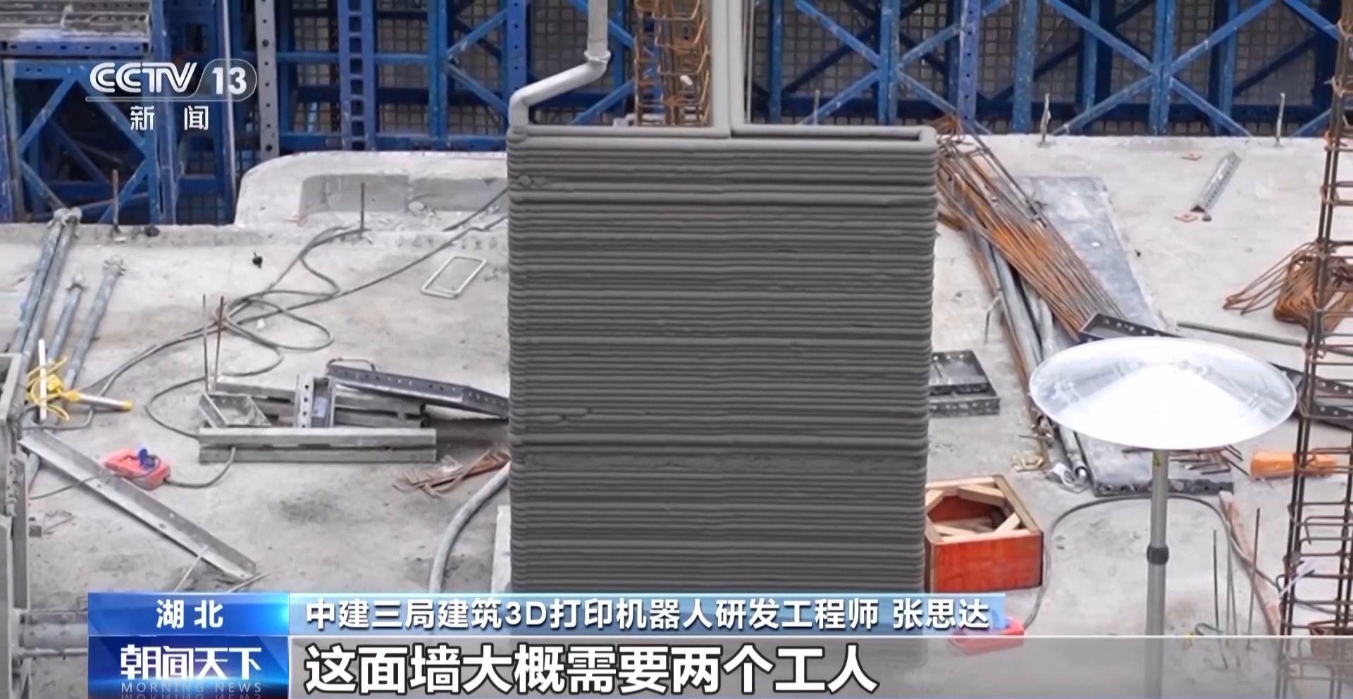 中建三局建筑3D打印机器人研发工程师 张思达:传统砌筑的话,这面墙大概需要两个工人,大半天的时间去完成。用我们3D打印的话,两个多小时就可以完成。