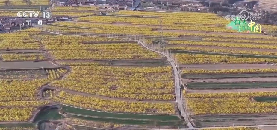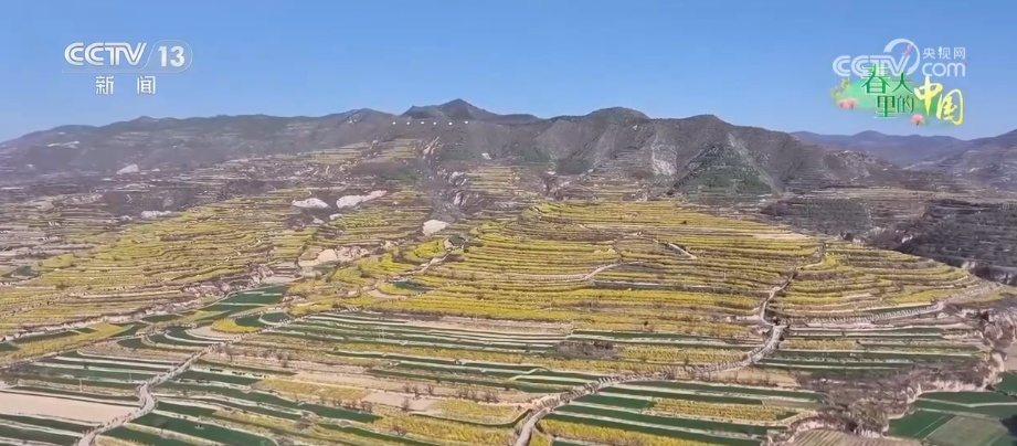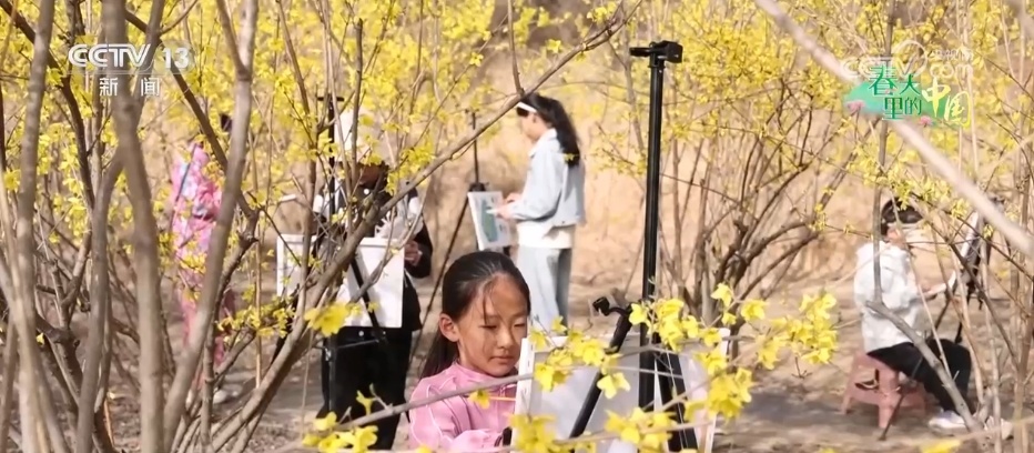 从空中俯瞰,连片连翘花布满了黄土高原的层层梯田,目之所及尽是金黄。徜徉花海间,簇簇连翘或抱团盛放,或疏密相间点缀枝头。孩子们踏青写生,支起画架、执起画笔,用斑斓油彩将春色定格于方寸画布之间。
