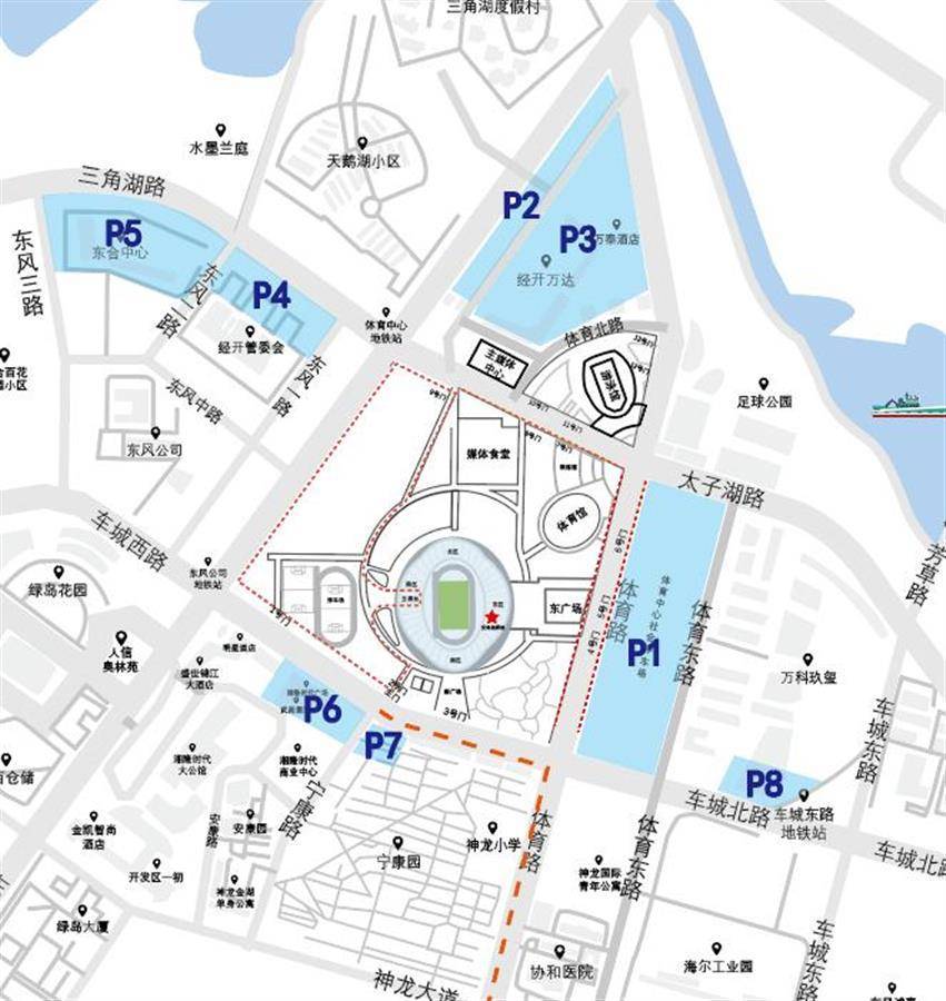 1.由于当天观众较多,体育中心周边道路车流增多,前往体育中心周边的人员请尽量错峰出行,高峰时段请做好出行规划,尽量避免进入体育路(东风大道至神龙大道)、太子湖路(东风大道至芳草路)、体育东路、车城北路(东风大道至车城东路)、宁康路路段,需通行区域的人员或车辆,可选择绕行神龙大道、沌阳大道、太子湖北路、江城大道等外围道路。