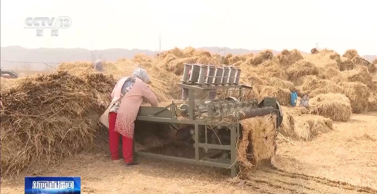 这里就是机械草方格的编织现场,4台编织机正同时高效作业。工人们熟练地铺展麦草,不一会儿,一条条刷状网绳式沙障便制作完成了,每天可生产8千米。