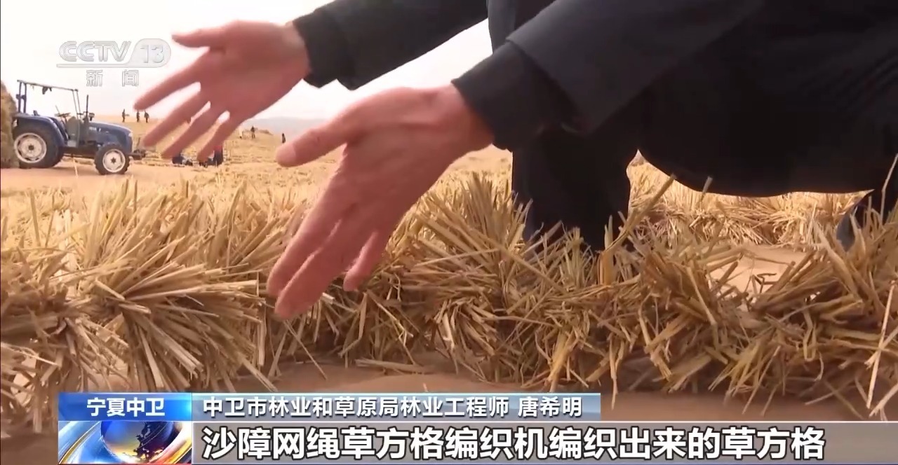中卫市林业和草原局林业工程师 唐希明:这个是我们发明的一种沙障网绳草方格编织机编织出来的草方格,人工扎的草是60厘米,可是这个草编织出来只需要20厘米,在这个过程中,我把它的材料节省了60%。