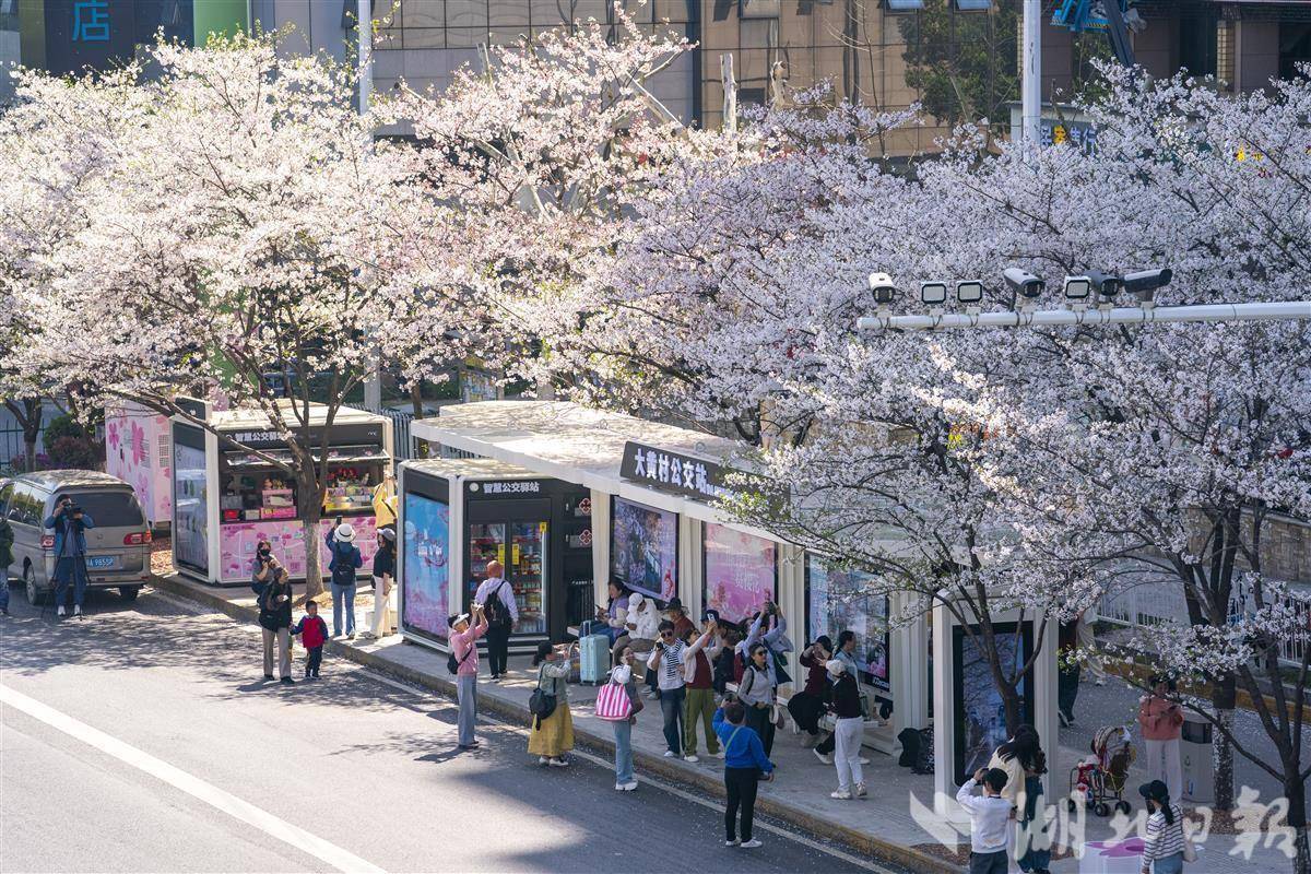 大黄村公交站,市民、游客在樱花环抱、焕然一新的白粉色站台上赏花、打卡、拍照。(湖北日报全媒记者 魏铼 通讯员 黄珍 摄)