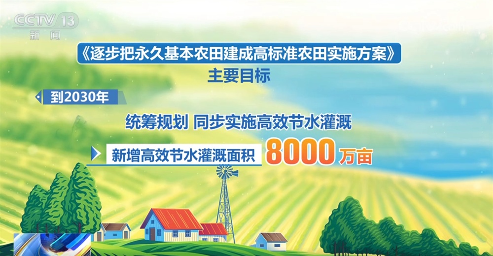 《实施方案》的主要目标是:到2030年,力争累计建成高标准农田13.5亿亩,累计改造提升2.8亿亩,统筹规划、同步实施高效节水灌溉,新增高效节水灌溉面积8000万亩;到2035年,力争将具备条件的永久基本农田全部建成高标准农田,累计改造提升4.55亿亩,新增高效节水灌溉面积1.3亿亩。