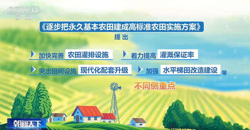《实施方案》优化高标准农田建设空间布局和时序安排,依据区域资源禀赋、耕作制度和行政区划等,将全国高标准农田建设分为7个区域。提出了加快完善农田灌排设施、着力提高灌溉保证率、突出田间设施现代化配套升级、加强水平梯田改造建设等不同的侧重点,通过补足短板弱项,打开粮食增产空间。