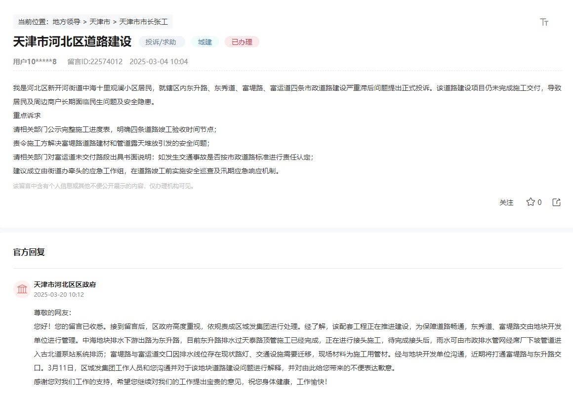 收到留言后,天津市河北区政府高度重视,依规责成区城发集团进行处理。